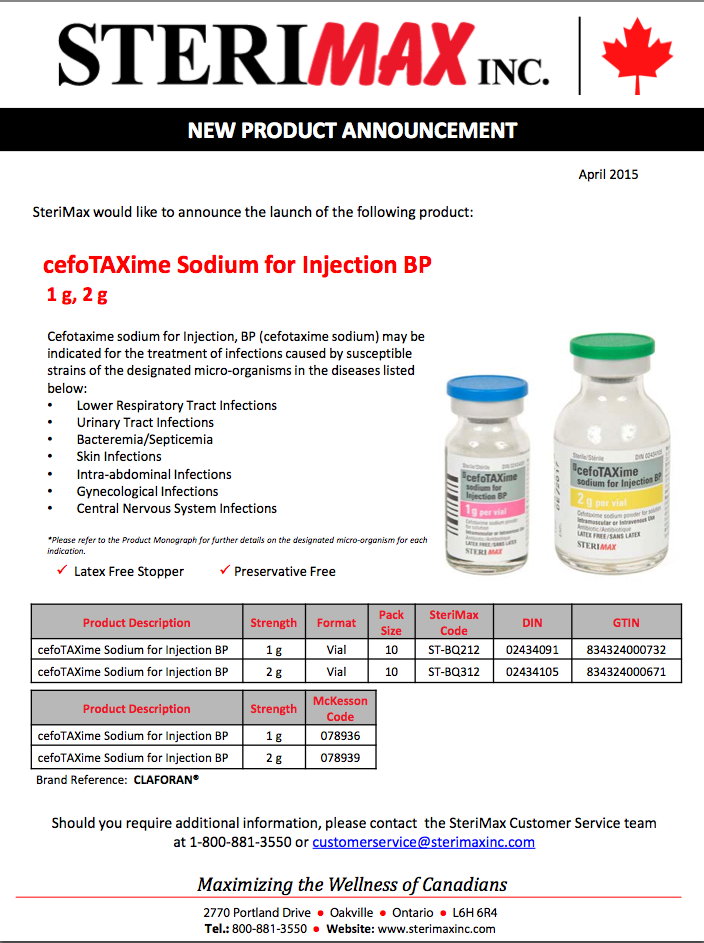 SteriMax is pleased to announce the launch of Cefotaxime for Injection in 1 g and 2 g strengths. To learn more visit the Cefotaxime product page.